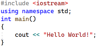Рассмотрим структуру простой программы на языке С++. Программа начинается с подключения библиотеки iostream с помощью команды #include <iostream> Библиотека (в программировании) — это сборник готовых и проверенных решений или компонентов, которые программист может использовать в своих программах. Для языка С++ существует много готовых библиотек. По ходу прохождения курса вы будете подключать различные библиотеки к своим проектам и использовать их возможности. iostream – библиотека, которая содержит готовые функции ввода и вывода информации в программе. Из этой библиотеки мы будем использовать команду cout. Информация о ней ниже. Команда using namespace std нужна для того, чтобы было удобнее пользоваться возможностями библиотеки iostream. После этой команды нужно поставить точку с запятой, иначе программа не скомпилируется, так как выйдет сообщение об ошибке. Можете это проверить. Функция main Функция — это подпрограмма, набор команд, выполняющих определенную задачу. Функция имеет им