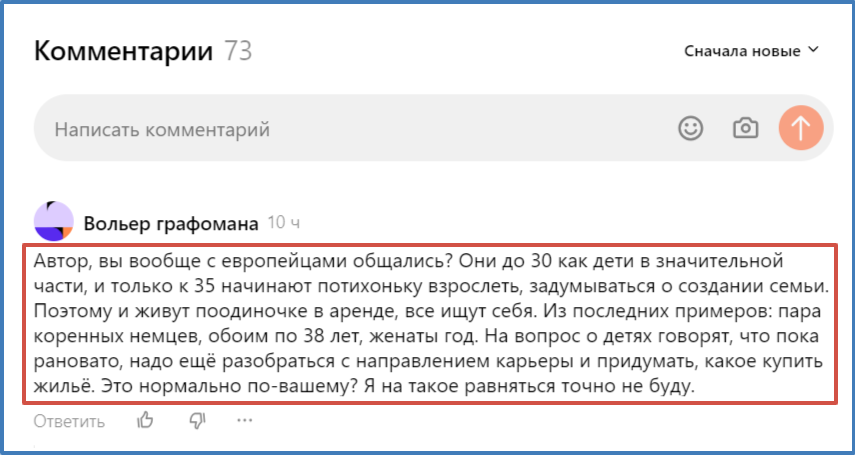 Вопросы эти - как как там у них с жильём, и как там у нас с деторождением? - интересны многим, но среди прочих появился и вот такой комментарий под той статьёй от подписчика: