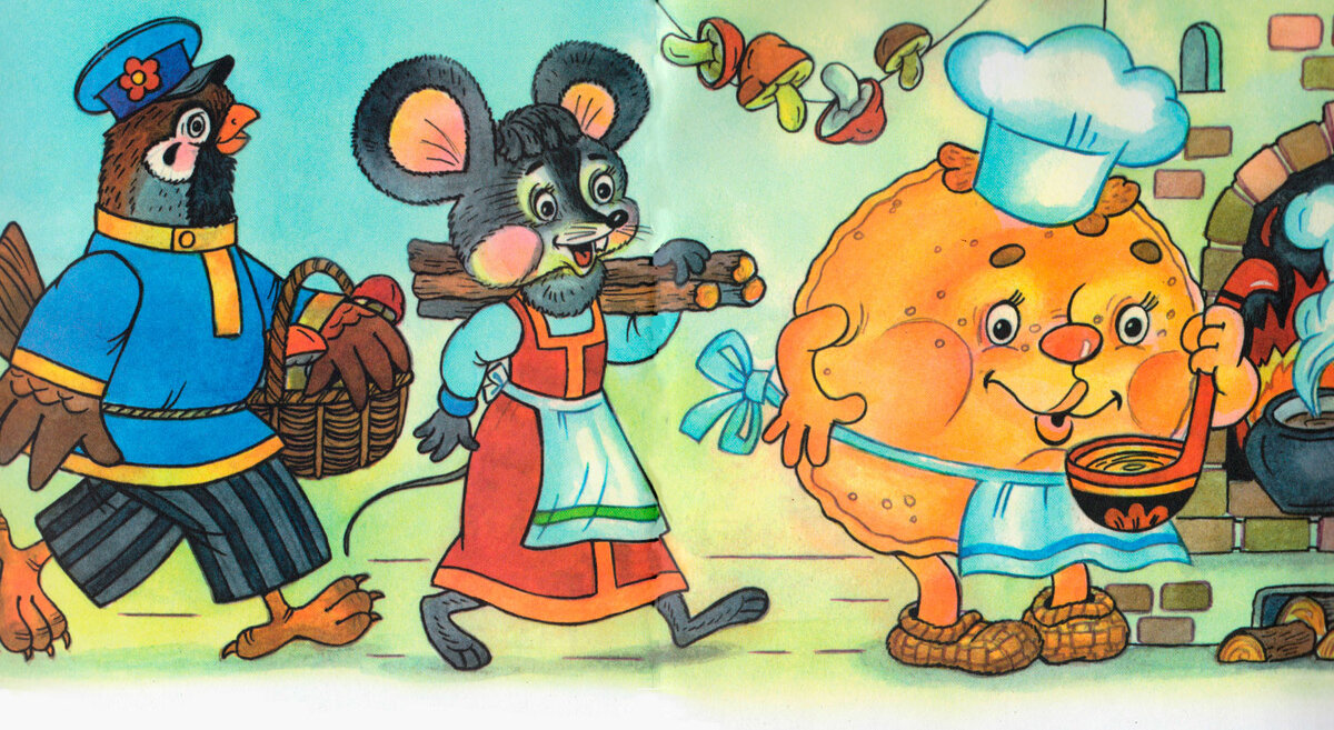 Вспоминаем, что в сказке Крылатый, мохнатый да масленый сказано про приготовление еды. Этим поначалу занимался Блин, а потом Мышка. Меню у них было, судя по сказке, не очень - боярские щи да каша. Каждый свою работу делал, другому помогал. Воробей еду приносил — с полей зёрен, из лесу грибов, с огорода бобов. А блин у печи — румян да пышен — щи варит, крупной солью солит, кашу пробует. — Да и я, — говорит воробей, — не промах: соберу грибов, натащу бобов — вот вы и сыты! А блин кричит:
