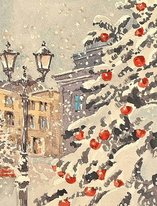 Для праздничного настроения отлично подойдет создание открыток. Они могут стать и приятным подарком вашим близким. Небольшой формат не отнимет много времени, а удовольствие будет обеспечено. Предлагаем вам пошаговый мастер-класс по созданию открытки из книги «Акварельные сезоны: Чародейка-зима». Материалы Для открыток я использую плотную хлопковую бумагу формата А5. Создаю рамку с помощью бумажного скотча и работаю по сухому, используя небольшие синтетические кисти. Вот такая открытка у нас получится в итоге: Мастер-класс 1. Создаем детальный карандашный рисунок и сразу же маскирующей жидкостью наносим точки по всей поверхности листа. Это будет падающий снег. Даем рисунку как следует высохнуть. Цветовая палитра Затем закрываем снег на елке с помощь смеси кобальта синего и сиены жженой. Создаем чуть серо-синий оттенок, достаточно прозрачный. 2. Тем же колером закрываем небо и площадь, аккуратно обходя здания и фонари. 3. Закрашиваем здания в следующем порядке: 4. Кадмием красным закраши