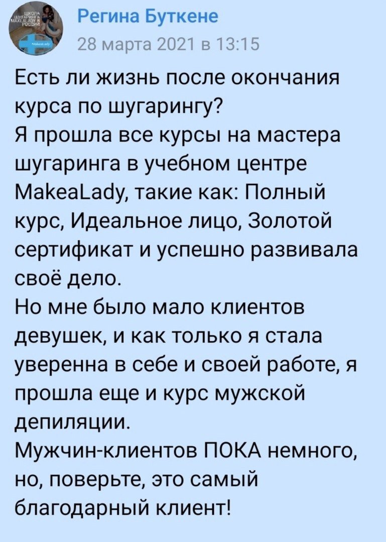 Вот такие отзывы оставляют наши ученицы, прошедшие курс по мужской депиляции. Ждем вас на наших курсах. Записаться можно здесь - https://vk.com/makea_lady