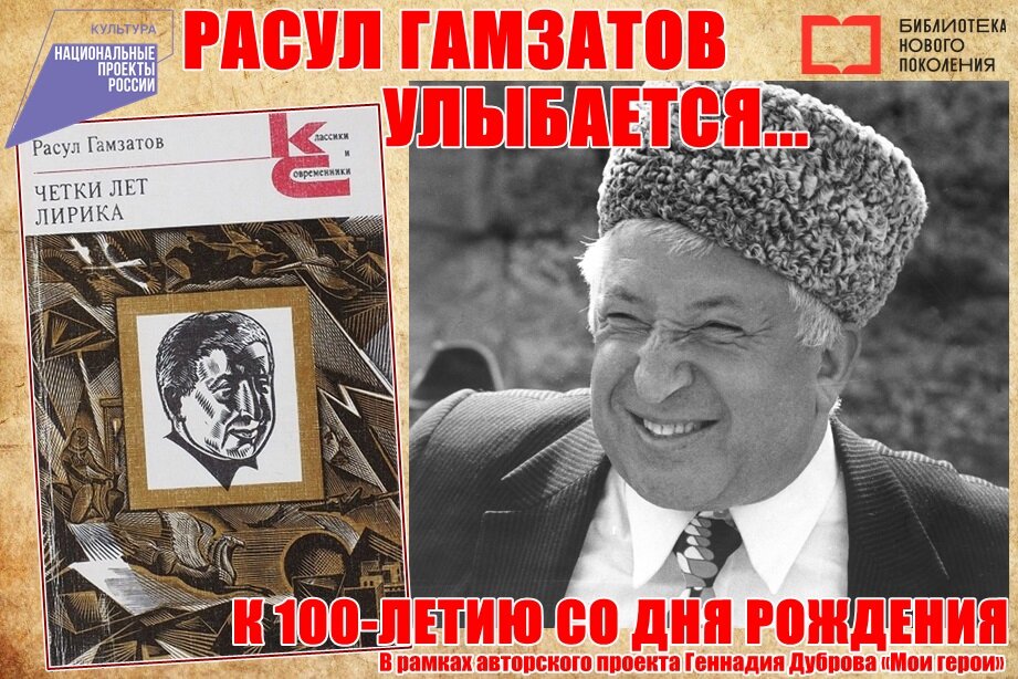 К 100-летию со дня рождения Расула Гамзатова (8.09.1923–3.11.2003) Одного вдохновения для поэта недостаточно – требуется вдохновение развитого ума. Шиллер Многие знают Расула Гамзатова по его бесподобному стихотворению, ставшему одной из лучших песен России. Конечно, все угадали, что речь о его «Журавлях». Это истинный шедевр, созданный одним из самых лучших поэтов, которого дал миру наш любимый Северный Кавказ. Низкий поклон и переводчику этого стихотворения Науму Гребневу. Но насколько глубок автор этого стихотворения, узнаёшь, лишь погрузившись в его творчество целиком, самозабвенно, в его мысли, мудрые и такие истинно мощные в созидательном плане энергетики Добра. Тот, кто читал книги Расула Гамзатова, не смог не заметить такой факт. Будучи настоящим Поэтом с большой буквы, он терпеть не мог тех, кто научившись рифмовать, автоматически самопровозглашал себя тоже поэтом. И Гамзатов во многих своих сатирических стихах высмеивает таких горе-поэтов, в том числе обладателей «корочек» с