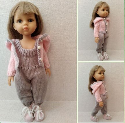 Вяжем комбинезон и кофту спицами для Паолы Рейна 32 см. Для работы использую спицы №3. Комбинезон. Набираем 70 петель и 4 ряда вяжем резинкой 1х1. 5 ряд: кромочная, 8 лицевых, 17 лицевых закрыть, 18 лицевые, 17 лицевых закрыть, 8 лицевых, кромочная. 6 ряд: кромочная, 8 изнаночных, 4 петель набрать, 18 изнаночных, 4 петель набрать, 8 изнаночных, кромочная. Итого 44 петли. Далее 3 см вязать чулочным полотном (лицевые ряды - все петли лицевые, изнаночные ряды - изнаночные петли). Обозначаем талию: в лицевом нечетном ряду прибавляем 41 петлю. Кромочная, лицевая, накид, лицевая, накид, лицевая, накид и так до конца ряда. В изнаночном ряду все петли, в том числе и накидные, провязать как изнаночные петли. Получившиеся 85 петель 3 см вязать чулочным полотном. Маркируем центр полотна 43 петлю (булавкой, маркером, скрепкой и т.д.) Кромочная, лицевая, накид, вяжем до маркера. перед маркером (43 петлей) делаем накид и за 43 петлей делаем накид. Вяжем оставшиеся петли и перед последней лицевой пе