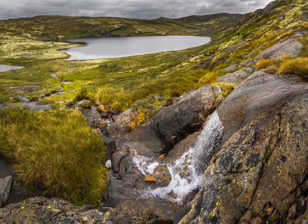 Сегодня мы запланировали полуднёвку. Встали поздно – около 11 часов. Традиционно – кофе и каша с сублиматами фирмы «Гала-Гала». Я походил по окрестным озёрам, покидал блесну. На первом озере пусто. На верхнем малом тоже ничего. Решил подняться на соседнюю вершину вдоль шумного водопада. Вышел на плато. Наверху я обнаружил множество сейдов самой разнообразной формы: от мелких, небольших до крупных, гигантских. Тысячи их раскидано по Кольскому полуострову. Они имеют ледниковое происхождение. Каменные глыбы большого размера при таянии ледника опустились на своих меньших собратьев. Любители мистики относят их появление к человеческим деяниям. Я сделал серию фотографий на тему «Сейды Кольского полуострова». Отправился вниз в поисках Ирины, которая исследовала полянки на предмет морошки. В этом году по словам местных и по факту вкус