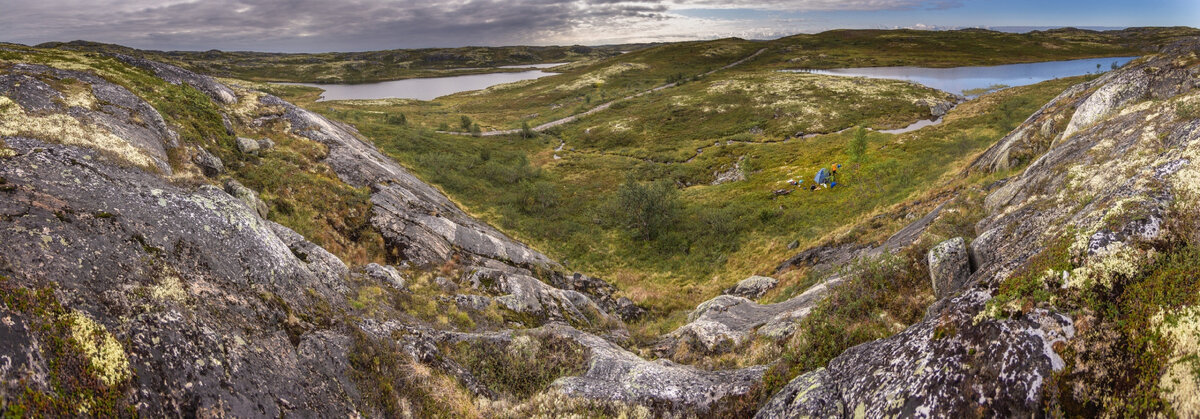Наша стоянка была на пограничье тундры и леса. Вокруг мхи и лишайники, а у палатки пара берёзок. Я запланировал ранний подъём для того, чтобы к четырем вечера, когда в Печенгской губе ожидалась точка максимального отлива, быть у брода через реку Каккурийоки. Брод легко проходится два раза в сутки во время отливов, расписание которых заранее посмотрел в сети. Поднявшись в шесть утра, сделал несколько забросов блесны в ближайшие озёра. Безрезультатно. Но зато набрал морошки на болотных кочках. Погода налаживалась. Облачность засасывало на восток, а с запада шло голубое небо и солнце. За время сборов успели высушить все промокшие вещи.