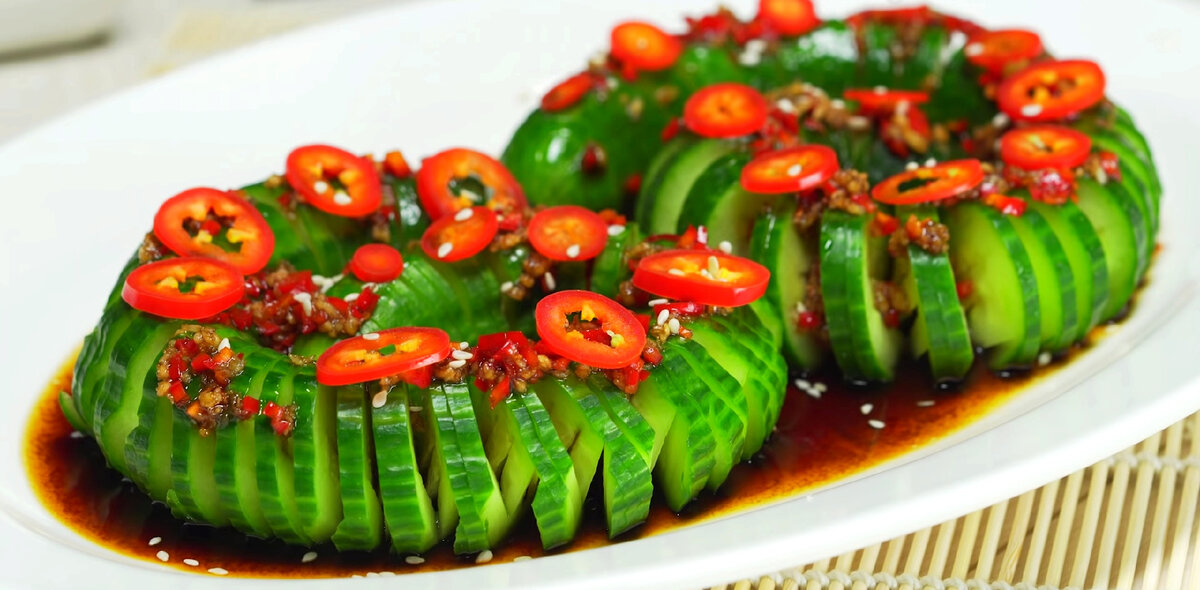 Огурцы в китайской кухне занимают особенное место, и существует множество рецептов для их приготовления. От салатов и супов до закусок — огурцы используются битыми, жареными, тушеными, вареными, маринованными и острыми. У каждого из этих блюд свой неповторимый вкус. Я предлагаю вам приготовить салат из огурцов по-китайски с оригинальным соусом и интересным способом нарезки. Этот салат готовится быстро и станет не только отличной закуской, но и стильным украшением любого стола. Приятного аппетита! Ингредиенты: Пошаговый процесс: 1. Разместите огурец между двумя палочками для азиатской еды и нарежьте его под прямым углом тонкими кольцами толщиной 2-3 мм. Нож будет касаться палочек, не разрезая огурец полностью. 2. Переверните огурец не разрезанной стороной вверх, поместите палочки с обеих сторон и нарежьте огурец под углом примерно 30° также толщиной 2-3 мм по всей длине. Результатом будет спираль из огурца. 3. Мелко нарежьте чеснок и перец чили. Подготовьте маринад, смешав чесно