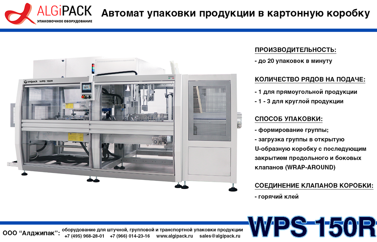 Надеемся, что данным материалом нам удалось расширить Ваше представление об оборудовании Smipack, его возможностях и применимости. Отправьте описание Вашей задачи по реквизитам офиса Алджипак, приведенным в конце статьи, и мы подготовим для Вас индивидуальное решение, максимально учитывающее Ваши пожелания и потребности. Не будет лишним коснуться и вопроса экономики. Естественно, цена комплекта WPS рассчитывается индивидуально, в каждом конкретном случае принимая во внимание особенности конструкции и набор функциональных элементов, а также наличие или отсутствие необходимости перенастроек на разные форматы упаковки или типоразмеры продукции. Но можем сказать ответственно, что, с учетом валютного курса евро на день публикации этой статьи, при замене 3 – 4 сотрудников на участке упаковки базовый комплект WPS 150R, см. ПРИМЕР 1, окупается в течение 2 – 2,5 лет.