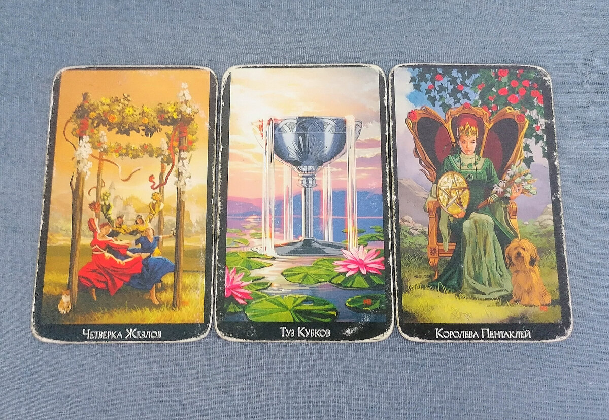 Кто-то любит и использует рунические формулы для привлечения (любви, работы, денег и т.д.), а кто-то любит Таро-формулы. Соединяем нужные картинки, вешаем (на стену, на рабочий стол или над входом в помещение). Вот, например, формула привлечения и притока клиентов и денег в бизнес (на фото 4 Жезлов, Туз Кубков, Королева Пентаклей). Использована колода Колдовское Таро. Помним, что выбор колоды важен. Если эти же карты Вы соедините на другой колоде, смысл всего расклада может поменяться (изображения разные, направления фигур другие). Если Вы хотите использовать Таро-формулы, о чём важно знать? В каком случае они будут работать? Здесь важно соблюдение двух пунктов: 1) Свою колоду Вы должны чувствовать вдоль и поперёк (обычно это много лет практики), 2) У Вас должна хорошо работать визуализация. В противном случае, если значения карт своей колоды Вы не до конца понимаете, не знаете, как работают соединения карт, визуализация своих желаний Вам даётся с трудом, Таро-формулы применять не сто