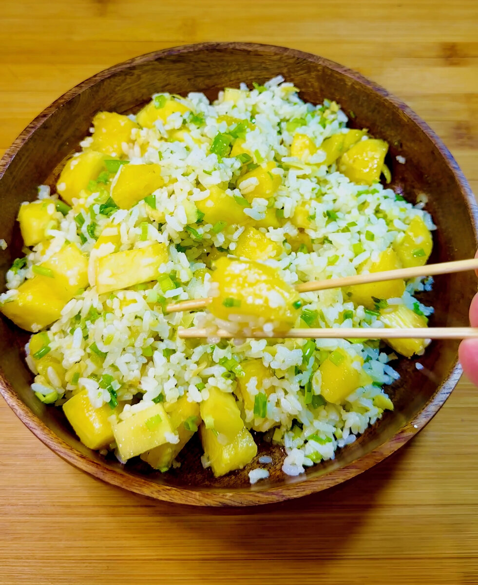 Рис с имбирем и ананасом Ингредиенты Рис длиннозерный - 7 столовых ложек Растительное масло - 2 столовые ложки Зеленый лук 3-5 стеблей Соль 1 шепотка Имбирь - 2 чайных ложки Ананас 80 -100 Гр Кунжутное масло - по вкусу Приготовление: 1. Рис промыть и обсушить. Переложить в сотейник, залить водой и довести до кипения. Угасить огонь до слабого и варить под крышкой около тринадцати минут. Снять с огня и оставить на пять минут. Затем взбить лопаткой, выложить на противень, остудить в течение 30 минут. Убрать в холодильник на 2 часа. 2. Ананас нарезать кубиками. 3. Разогреть вок на среднем огне. Добавить масло. Бросить тертый имбирь и измельченные белые части стеблей зеленого лука, поджарить, помешивая, в течение минуты. 4. Добавить рис и жарить десять-двенадцать минут до появления золотистого цвета. Снять с огня. Добавить оставшийся измельченный лук, ананас и заправить кунжутным маслом.