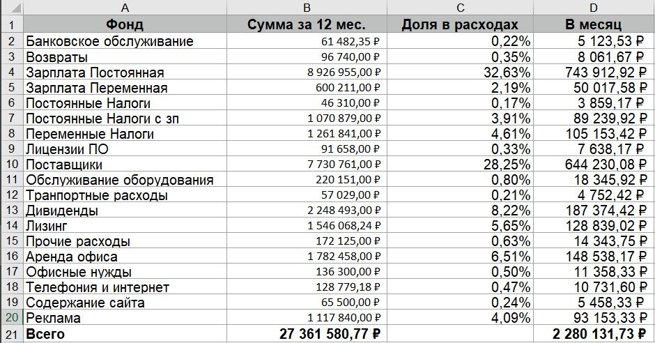 - Определяем сумму расходов исходя из средних расходов в месяц и планов на будущее. Т.е. мы смотрим сколько мы тратили в прошлом и сколько планируем (хотим) тратить в будущем. В таблицу заносим цифру с учетом корректировки на наши планы. Например: в прошлом году на «офисные нужды» мы тратили 11 358,33 руб./мес. В этом году хотим тратить 20 000,00 руб./мес. – эту цифру и заносим в таблицу для расчетов.
