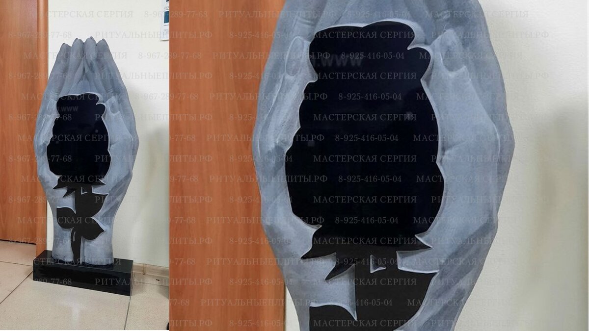 Мастерская Сергия представляет новую эксклюзивную модель в виде сложенных рук, держащих цветок на подставке, изящно очерченные и выразительно сложенные ладони с длинными пальцами, по центру расположен резной цветок из черного классического камня - Габбро-Диабаз, полированная поверхность красиво контрастирует с необработанными ладонями и создает невероятно нежную композицию, которая сохранит и долговечно увековечит память о любимом человеке. Ладони вырезаны из большого цельного камня нашими мастерами на фрезерном станке с ЧПУ, руки символизируют как орудия воздействия на окружающий мир, медиатора в передаче духовной и физической энергии, часто выступают образом бога, орудием творения и разделения мира, правая ладонь является символом духовного влияния, милосердия и искренности, левую же ладонь ассоциируют с честью и достоинством. Данная фигура памятника представляет собой глубокий символизм, эстетический образ цветка между ладонями создает образ призыва к милосердию и божественной милос