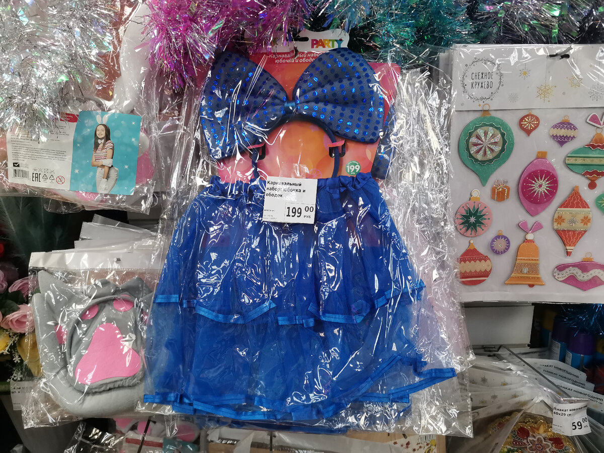 Мы как раз попали на такой завоз вечером 30 ноября. Мало что сфотографировала, из-за коробок не везде можно было подойти, так что заметка будет не большая. Самое актуальное в декабре - карнавальные новогодние костюмы для детей. По 199 рублей юбка и ободок. В наличии были синие с бантиком, белые и розовые со звёздочками. Очень сильно юбка просвечивается конечно, особенно белая и розовая. Ещё один вариант праздничных нарядов - аксессуары для костюма животных. Лиса, кошка, мышка, зайчик. Цену, увы, не помню, а сфотографировать забыла. В наборе ободок с ушками, бантик на шею, перчатки-лапки и хвост. В отделе чулочко-носочных изделий я заметила новые носки с новогодней тематикой. С большим объемным снеговиком, конечно, самые заметные, но я хотела себе взять со снегирями, песочного цвета. Не взяла, а теперь думаю что надо сходить, у меня на зиму вообще ни одних носок нет. Только боюсь что это синтетика галимая окажется. Проходила мимо хозтоваров и увидела квадратные тазы по 124 рубля. Вообщ