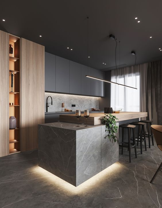Кухонный островок может выполнять не только функцию рабочей поверхности, но и быть местом для хранения посуды и кухонных принадлежностей. Если площадь позволяет, можно добавить встраиваемые полки или ящики, чтобы максимально эффективно использовать пространство островка.Или к примеру сделать винный шкаф внутри острова.