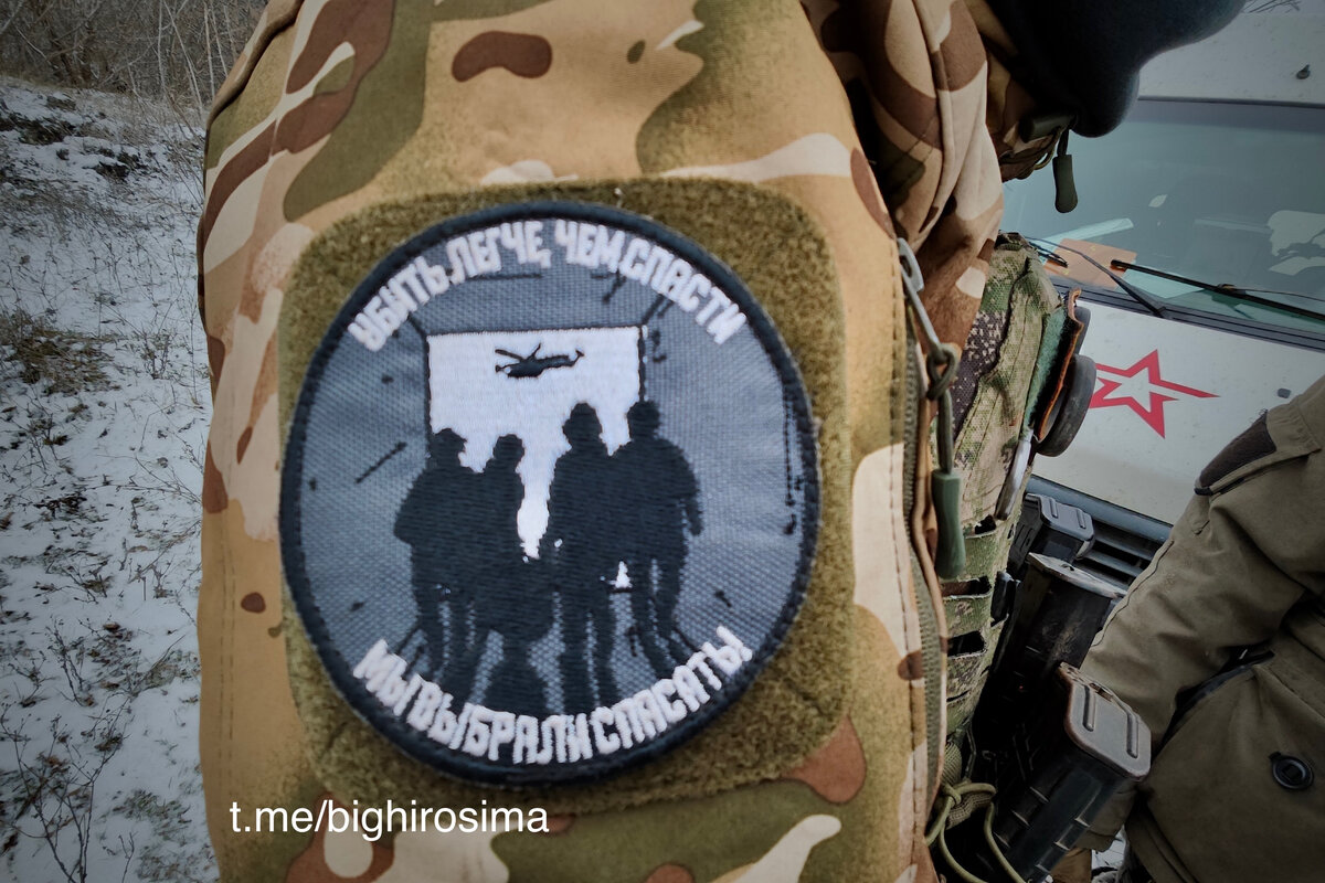 Да вы только посмотрите на него! Жгуты, вместо погон, на груди православная икона с ножницами, автомат в руке. Мало кто снимается без балаклавы или не просит заретушировать себя. И он с открытым лицом. Такие они - фельдшеры медроты мотострелкового полка Клещеевского направления. Клещеевка и Авдеевка - сейчас это два самых сложных направления на фронте. Оперируют на морозе, под прицелом летающих камикадзе над головой. Вывозят раненных на себе, каждую секунду рискуя жизнью. Женя называет ребят ангелами жизни. Такие и есть. И если бы не медики, большинство раненных просто не доехало до госпиталей, где их уже стабилизируют. От их скорости, отваги, смелости и профессиональных умений зависят жизни.