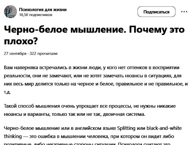 Про плохизну «чёрного-белого мышления» авторы публикаций дружно расшифровывают, что оно является чётким примером когнитивного искажения, что оно деструктивное, вредоносное, соответствует низшему уровню психического развития, формирует психические расстройства. Соответственно, что от такого мышления лучше бы побыстрее избавиться.