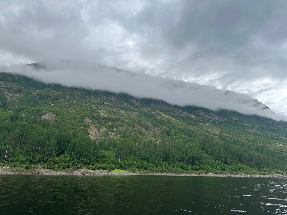 На кордоне заповедника, впервые на Путоранах нас встретило хмурое утро. Забегая вперед скажу, что это было единственный день, когда небо было затянуто облаками. На плоских вершинах гор лежали облака, и медленно стекали с них вниз, как глазурь с пасхального кулича. Зрелище потрясающее. Но не смотря на эту хмарь все равно было довольно тепло. И очень, очень влажно, что даже костер для приготовления завтрака дежурный разжег с большим трудом. Мы дожарили вчерашнюю щуку, собрали вещи, и в путь. Правда сначала нам голову покружила помпа на катере, которая отказывалась работать и сливать лишнюю воду. Виктор с Мишей долго колдовали над ней, и потом решили ее поменять, благо у Виктора этих помп запасных было в достатке. Все время провожу аналогию с прошлым разом и другим организатором, когда все ломалось, и чинить было не чем. Сейчас мы были в надежных руках, у Виктора все четко, человек опытный, бывалый, с ним точно не пропадешь нигде. Справившись с помпой мы отправляемся на базу к Шерешу, к