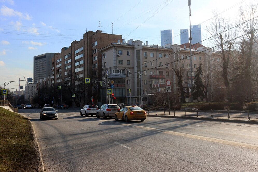 10. Вид в сторону Шмитовского проезда. Слева бывшее общежитие Института физкультуры, изначально построенное в составе комплекса в 1929 году (видимо, как жилой дом) с пристройкой 1994 года (посередине), но недавно перестроенное до неузнаваемости в офисный центр.