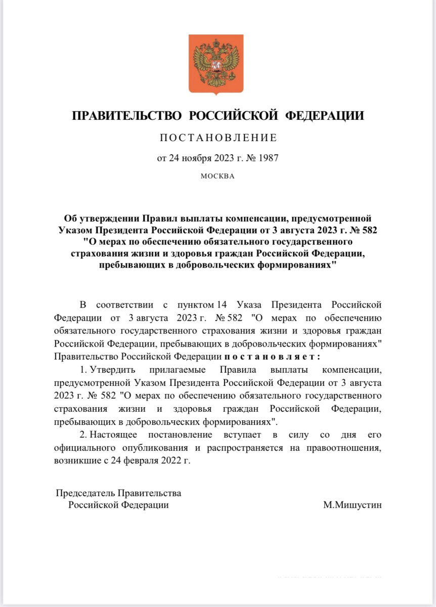Долгожданное для добровольцев постановление Правительства утверждающее правила выплаты компенсации, предусмотренной Указом Президента Российской Федерации от 3 августа 2023 г. No 582 "О мерах по обеспечению обязательного государственного страхования жизни и здоровья граждан Российской Федерации, пребывающих в добровольческих формированиях" наконец-то принято 🔥🔥🔥