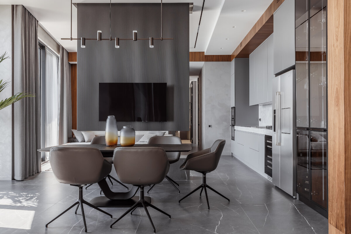 Работа над проектом началась еще в процессе строительства самого здания. Нужно было объединить несколько квартир в одно жилое современное пространство для семьи из четырех человек. Передо мной стояла задача объединить три квартиры в одно уютное и функциональное пространство для семейного отдыха у моря. Огромное преимущество этого объекта заключается в том, что высота чернового потолка составляет почти три с половиной метра, а видовая панорамная линия насчитывает шесть световых точек. Пространство поделено на три зоны: общая — это кухня-гостиная-прихожая, предназначенная для принятия гостей и совместного времяпрепровождения, и две приватных — мастер-спальни со своими гардеробными и санузлами, а также гостевые комнаты. Главным центром и одновременно связующим звеном кухни-гостиной является подвесная конструкция с паровым камином. Он просматривается со всех основных точек этого пространства, объединяя диван, обеденную группу и кухню. Характер интерьера подчеркнуто мужской, сдержанный, в с