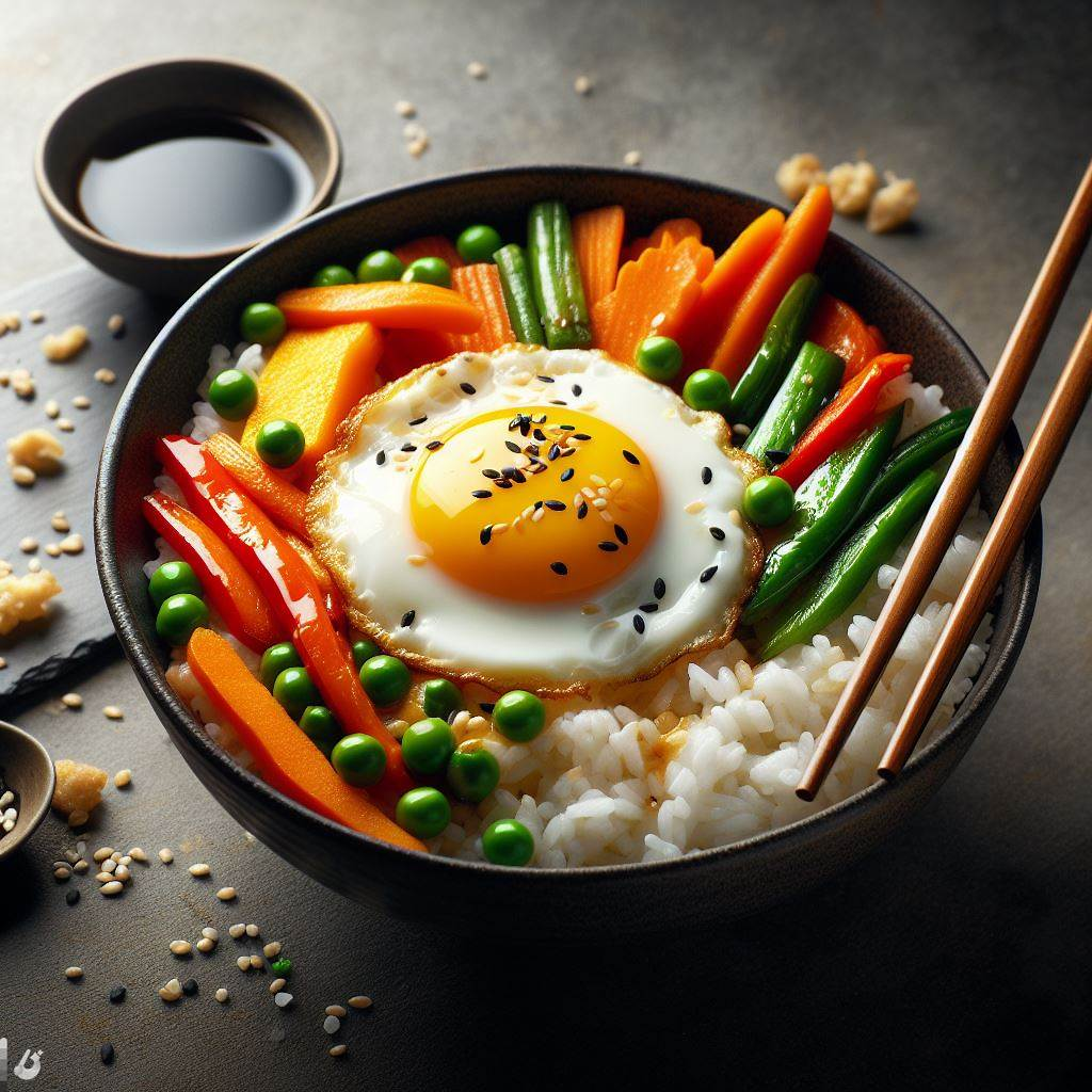 Смешайте готовый рис с обжаренными овощами и нарезанными омлетами.