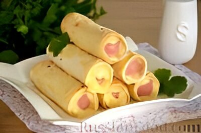 Сосиски с сыром в лаваше (в духовке) Фото к рецепту: Сосиски с сыром в лаваше (в духовке)