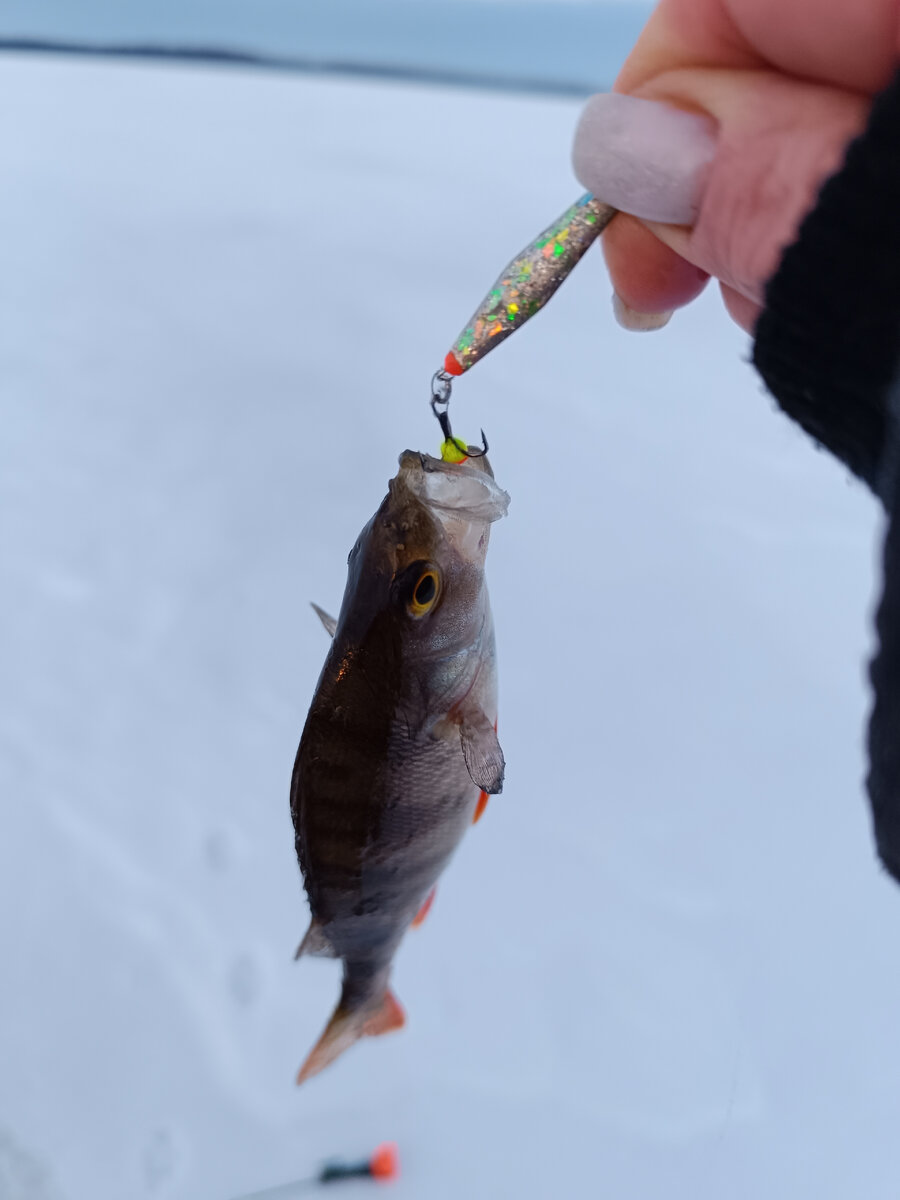 Доброго дня, уважаемые подписчики, спасибо что читаете мой канал! Очередной день отпуска, и опять я провела его на рыбалке. Морозит, -10 за бортом. Ещё и восточный ветер. Вещи упакованы в прицепные сани. Всё стандартно. Запасные перчатки, рукавицы, термос чай с имбирём и вишней. Поступает команда : -По матрешкам!!! (с) Юк в теплом костюме, сидит между мной и Алексеем. Хотя его законное место на руле снегохода, но так как он топчется на ходу, частенько нажимает кнопку "пуска" и техника глохнет, поэтому посередине) За 7 минут, от дома домчали к новому месту. Тут как то мыслила.. Мне до рыбалки ближе дойти -доехать нежели до работы)) И правда, живу у самого берега. Ну да ладно, продолжу. Прибыли. Тут мы часто ловили окуней в летнее время, одно из самых посещаемых нами мест. А теперь зима, и не факт что мы что-то поймаем. Когда уровень воды был низкий, глубины составляли от силы 1,6. Посмотрим что теперь.. Первая лунка около 2х метров, Сматываю леску, и не успела дна к
