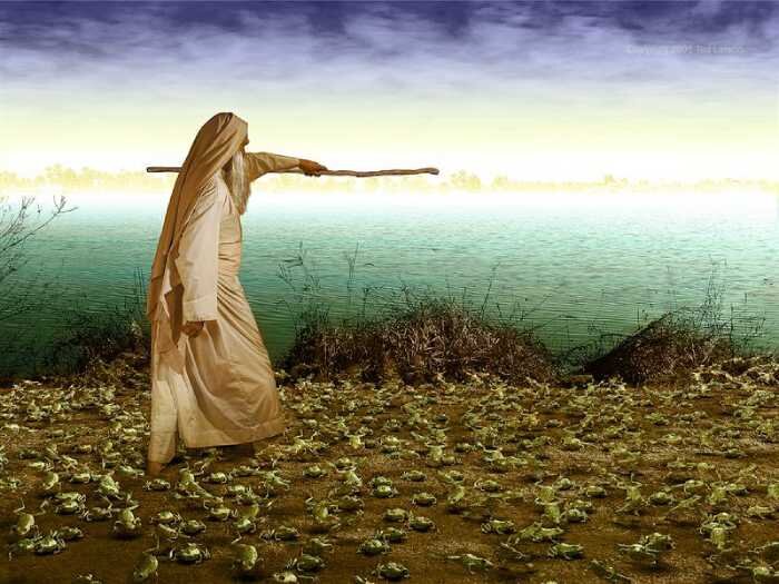 "И сказал Господь Моисею: «Пойди к фараону и скажи ему — так говорит Господь: 'Отпусти народ Мой, чтобы он совершил Мне служение. Если же ты не согласишься отпустить, то вот, Я поражаю всю область твою жабами; и воскишит река жабами, и они выйдут и войдут в дом твой, и в спальню твою, и на постель твою, и в дома рабов твоих и народа твоего, и в печи твои, и в квашни твои, и на тебя, и на народ твой, и на всех рабов твоих взойдут жабы'». И сказал Господь Моисею: «Скажи Аарону: 'Простри руку свою с посохом своим на реки, на потоки и на озёра и выведи жаб на землю египетскую'». Аарон простёр руку свою на воды египетские; и вышли жабы и покрыли землю египетскую. То же сделали и волхвы чарами своими и вывели жаб на землю египетскую" (Исх. 8:1–7).