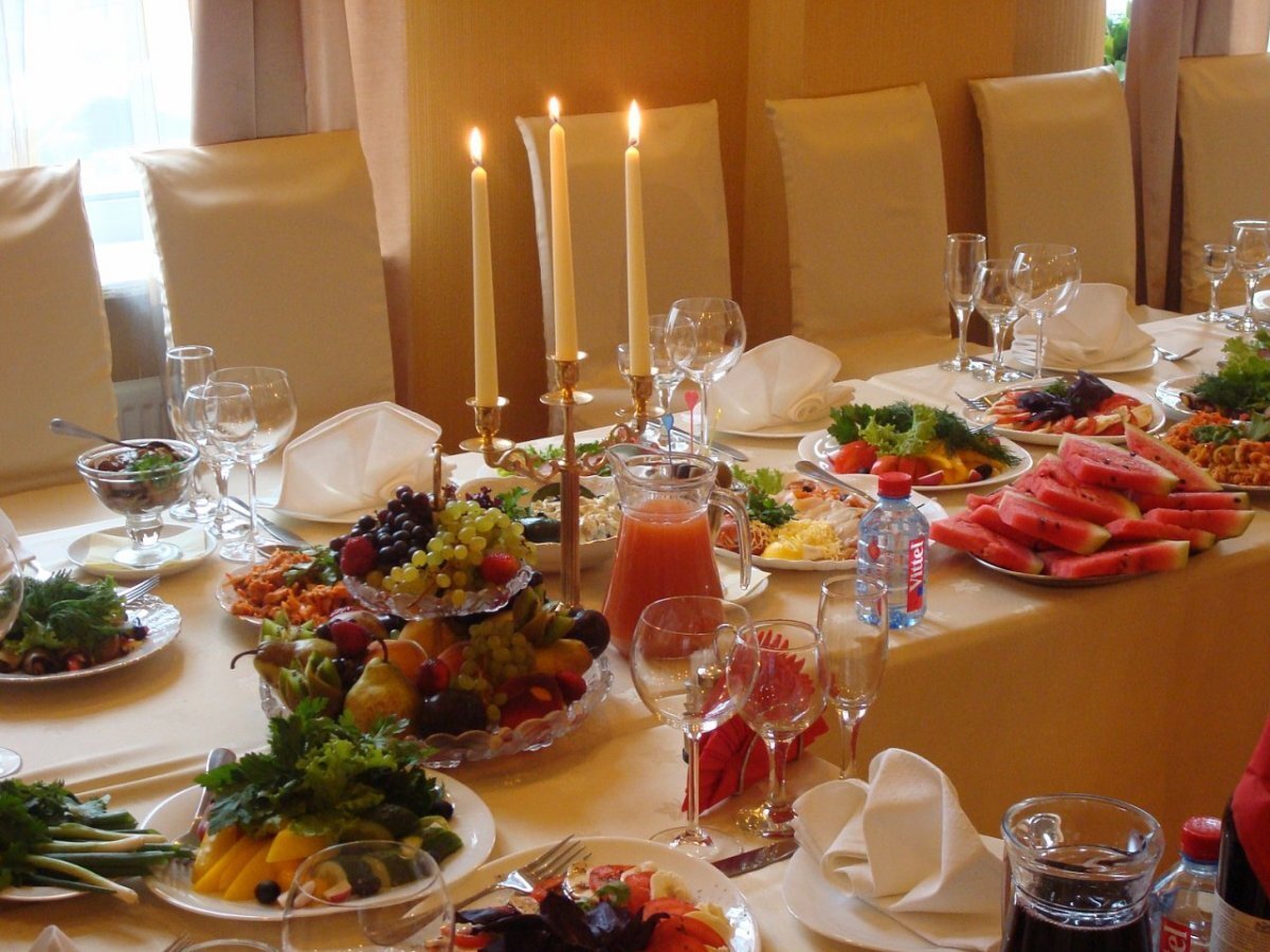 Праздничный стол — неотъемлемая часть новогодней ночи. Ароматные блюда и хорошие напитки обязательно дополнят сервировку своей оригинальностью. Праздничная сервировка значительно отличается своим изобилием деталей. Она задает праздничное настроение, дополняет торжественность мероприятия и рассчитана на долгие посиделки. Необходимо продумать базовую посуду — ту, которая необходима для основных блюд и напитков. Если вдруг одинакового набора не хватило, можно подобрать несколько наборов, объединив их по цвету или размеру. В центре стола можно поставить декоративную композицию или своё коронное блюдо. Если гостей будет много, то можно сделать именные карточки для рассадки, прикрепив на красивые декоративные прищепки к фужерам или положить в тарелки. Особое внимание уделите расстоянию между тарелками — не менее 50см, чтобы гостям было удобно есть трапезничать. Чаще всего приготовленные угощения не помещаются на стол, в таких моментах можно сделать зону фуршета, где гости самостоятельно смо
