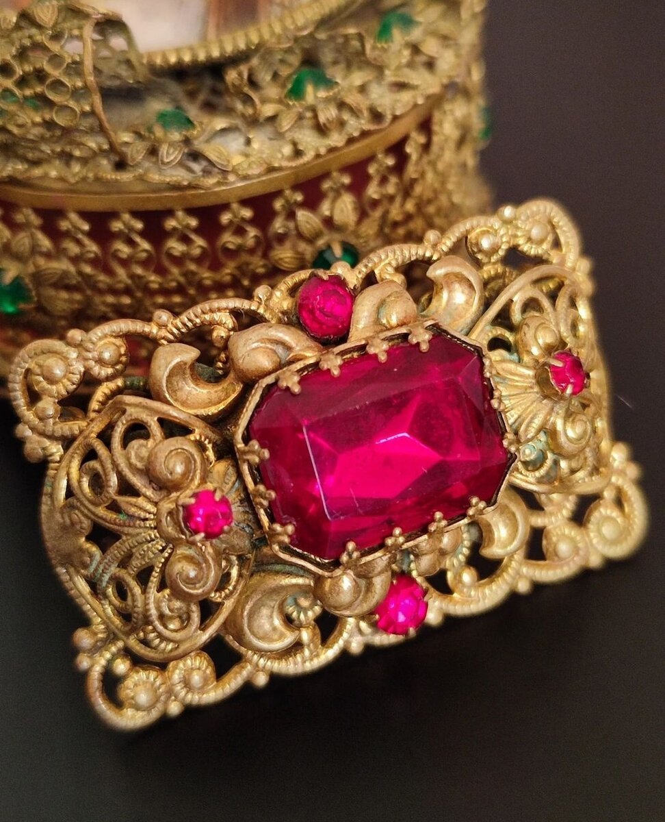 Тончайшие латунные узоры, вставки из чешских кристаллов делали украшения похожими на царские.