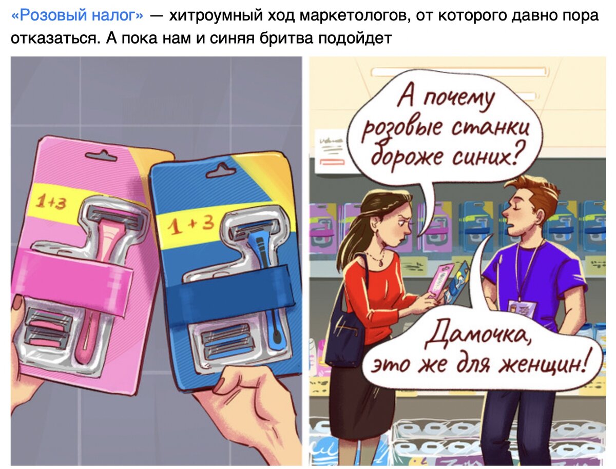 Для меня понятие налога - это в первую очередь нечто обязательное. От чего ты не можешь отказаться, или можешь, но с неприятными последствиями. Например, если не будешь платить налоги (на недвижимость, на транспорт, на доход от профессиональной деятельности и т.д.) - рано или поздно арестуют твои карты или имущество, если задолженности очень большие. Многие инстакоучи попались не на откровенном мошенничестве и продаже воздуха на своих курсах, а именно на неуплате налогов. Делали бы всё как положено - никто бы их не тронул. А вот “налог на розовое”, при котором женщины переплачивают за товар, потому что у него более “женственная” упаковка, надпись “для нее” или розовый металлический корпус - разве это можно считать налогом? Разве это обязательные покупки? Кто-то обязывает женщину купить дезодорант именно в розовой упаковке или туалетную бумагу с запахом персика? Обычные товары, без гендерных пометок на кассе откажутся пробивать, как алкоголь и сигареты - несовершеннолетним? Не хочетс