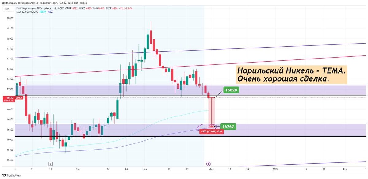 Многие забыли про нее, а очень зря - $GMKN или Норильский Никель : •Готовят сплит к апрелю 2024 года, что даст возможность внести много свежих средств в компанию. •Платят неплохие дивиденды с доходностью 5.4% или 915р по итогам 9 месяцев. •Находится на поддержке + имеет сильнейшую зону на 3.5% ниже - уровень 16300р. Мне очень нравится сделка и компания. Выглядит и правда перспективно, намного лучше многих активов на РФ рынке. Также, большой плюс в том, что сниженная волатильность не позволит вашему портфелю сильно падать на коррекции Не рекомендация.