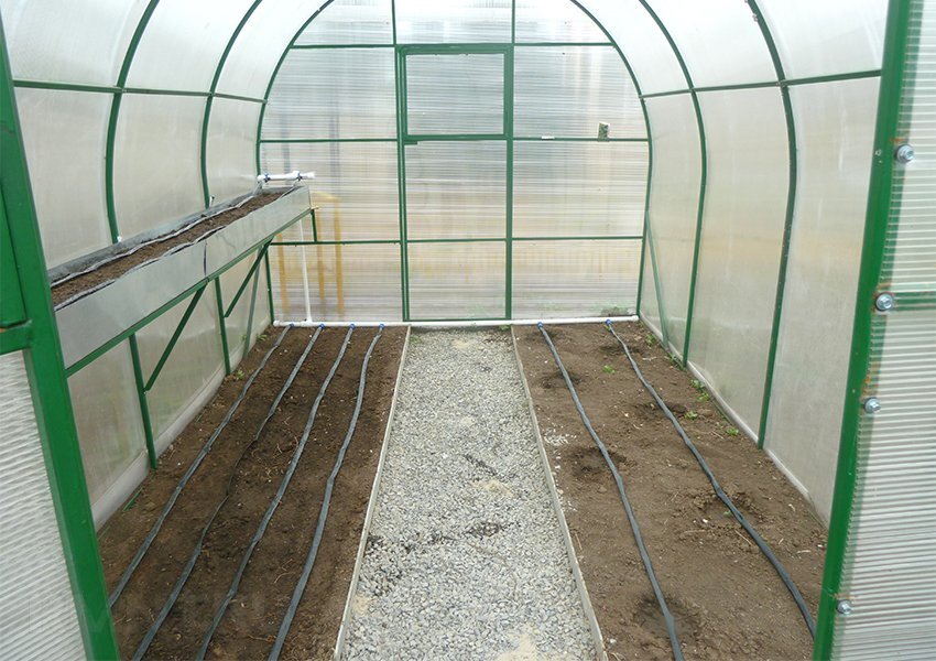 В теплице есть одно условие, способствующее более быстрому и технологичному разведению магистральных труб. Речь идет о кровле: на высоте пары метров над землей смонтирован каркас, так почему бы не использовать его для закрепления труб? В таком случае систему не пришлось бы полностью разбирать каждый год для вскапывания почвы, да и разводка по каркасу позволяет довольно точно выровнять трубы. Прокладка под крышей также способствует более интенсивному прогреву воды.