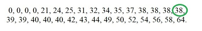 Среднее арифметическое, размах, мода и медиана ряда чисел Уважаемые мамы и папы, дедушки и бабушки! Предлагаю вспомнить размах, моду и медиану ряда чисел на примере решения задачи 193 из 8-го издания учебника по алгебре для 7-го класса авторов Ю. Н. Макарычева, Н. Г. Миндюк, К. И. Нешкова и С. Б. Суворова под редакцией С. А Теляковского. Условие: В организации вели ежедневный учёт поступивших в течение месяца писем. В результате получили такой ряд данных: 39, 43, 40, 0, 56, 38, 24, 21, 35, 38, 0, 58, 31, 49, 38, 25, 34, 0, 52, 40, 42, 40, 39, 54, 0, 64, 44, 50, 38, 37, 32. Для полученного ряда данных найдите среднее арифметическое, размах, моду и медиану. Каков практический смысл этих показателей? Решение: 1) В данном случае ряд чисел не является упорядоченным, поэтому для того, чтобы найти медиану, нам сперва придётся его упорядочить: Число чисел в ряду нечётное. Медиана – 38, она делит все дни на две одинаковые по количеству писем группы – те дни, в которые количество писем было 38