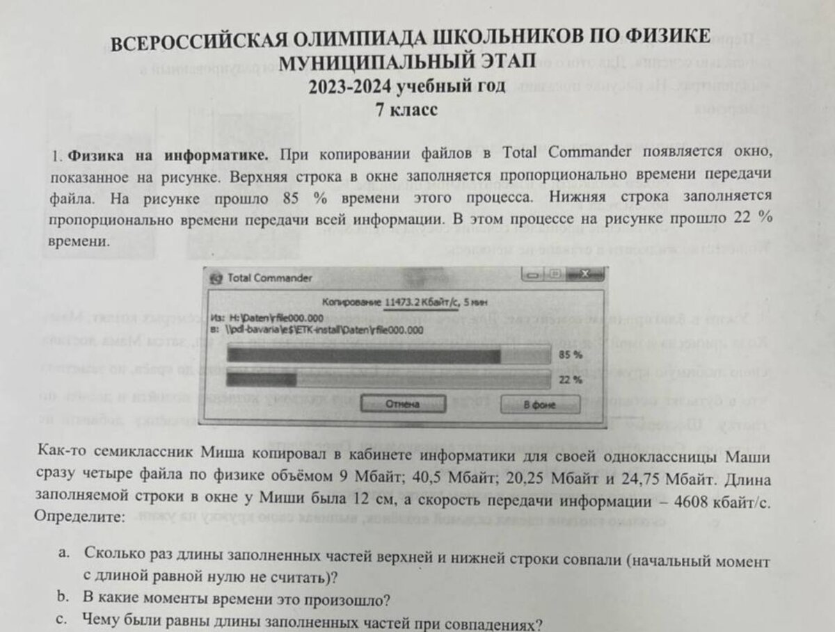 1. Физика на информатике. При копировании файлов в Total Commander появляется оКНо. показанное на рисунке. Верхняя строка в окне заполняется пропорционально времени передачи файла. На рисунке прошло 85 % времени этого процесса. Нижняя строка заполняется пропорционально времени передачи всей информации. В этом процессе на рисунке прошло 22 % времени. Как-то семиклассник Миша копировал в кабинете информатики для своей одноклассницы Маши сразу четыре файла по физике объёмом 9 Мбайт; 40,5 Мбайт; 20,25 Мбайт и 24,75 Мбайт. Длина заполняемой строки в окне у Миши была 12 см, а скорость передачи информации - 4608 кбайт/с. Определите: ПОЛНЫЕ ОТВЕТЫ УЖЕ ТУТ (НАЖМИ) ПОЛНЫЕ ОТВЕТЫ УЖЕ ТУТ (НАЖМИ) 2. Смешение скоростей. Экспериментатор Глюк снял данные с бортового компьютера велосипеда и построил в одних осях графики зависимости 4 V. M/C мгновенной и средней скорости велосипеда от времени для первых 16 секунд движения. Оставив листок с графиками на столе, он отошел пообедать. А вернулся, обнаружил,