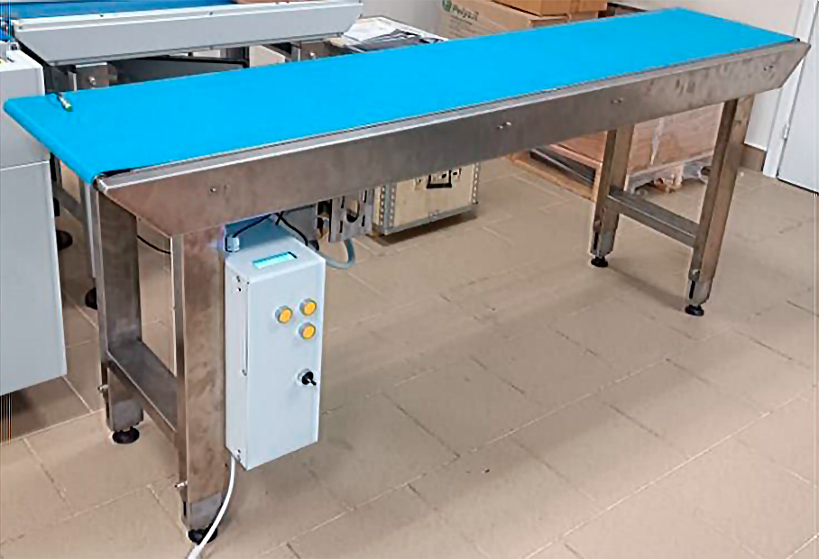Серия автоматических ленточных транспортеров ТЛ-Р применяется в качестве питающих (подающих) и отводящих транспортеров, и может использоваться со всем спектром автоматического упаковочного оборудования, включая упаковочные машины производства компаний Smipack и Plasticband. Транспортеры серии ТЛ-Р напрямую подключаются к автоматическим упаковочным машинам. Скорость движения транспортеров регулируется независимо, что позволяет подобрать оптимальный режим подачи продукции на упаковку, в зависимости от ее размеров. Преимущества транспортеров серии ТЛ-Р: 1. Все конструкционные элементы транспортеров изготовлены из пищевой нержавеющей стали AISI 316, транспортерные ленты пищевые, что позволяет без ограничений применять оборудование на пищевых производствах и производствах медицинских изделий и препаратов. 2. Центральный привод размещен в средней нижней части транспортера и не выступает за габариты несущей рамы, что позволяет ставить два транспортера параллельно друг другу с минимальным за