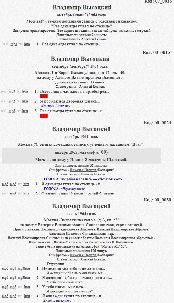 Как бы то ни было, а условные даты самых ранних из сохранившихся фонограмм перед вами. И если июнь у составителей каталогов и хранителей записей вызывает большие сомнения, то сентябрь-октябрь вполне могут быть самыми ранними исполнениями. Потому как нигде более первая строчка не имела такого вида, как здесь. В дальнейшем всегда пелось "Я однажды гулял по столице..." (за исключением выступления в Кёльне (1979) - там "Я недавно гулял...". Но там многое спелось не так, как обычно, тем более из раннего).