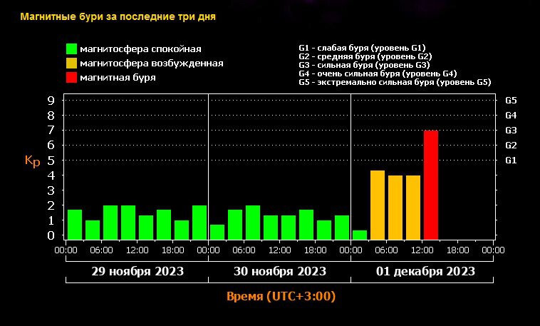 На Земле происходит сильная магнитная буря уровня G3 Возмущения магнитосферы Земли продолжили нарастать к вечеру 1 декабря. Магнитная буря превысила изначально прогнозируемую величину и достигла уровня G3 (сильная) по пятибалльной шкале, пишет в телеграм-канале ведущий специалист центра «ФОБОС» Михаил Леус. Предыдущая буря уровня G3 наблюдалась на Земле 5 ноября. По данным лаборатории солнечной астрономии ИКИ и ИСЭФ, рекордным событием этого года, а также последних нескольких лет остается буря от 23–24 апреля, которая в пике достигала G4. Событий уровня G5 не наблюдалось на Земле уже около 20 лет. Последняя буря соответствующего класса была зарегистрирована ещё 11 сентября 2005 года. Магнитные бури могут повлиять на работу энергетических систем и космических аппаратов, а также вызвать помехи в радиосвязи. Метеочувствительные люди могут чувствовать недомогание. Из плюсов — может появиться полярное сияние.