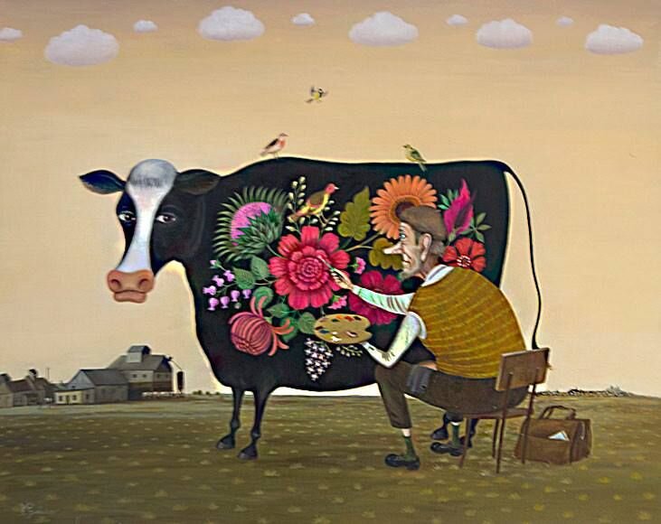 Мне для счастья не нужна пол-литра, Должен быть другой ориентир! У меня волшебная палитра, Ею я раскрашу скучный мир! Не надеть на творчество оковы, Мой полет фантазий не унять! Захотел бока родной коровы Яркими цветами расписать! Будет моя верная бурёнка Мою жизнь собою украшать, Как нарядная рождественская ёлка Среди поля красками сиять!
