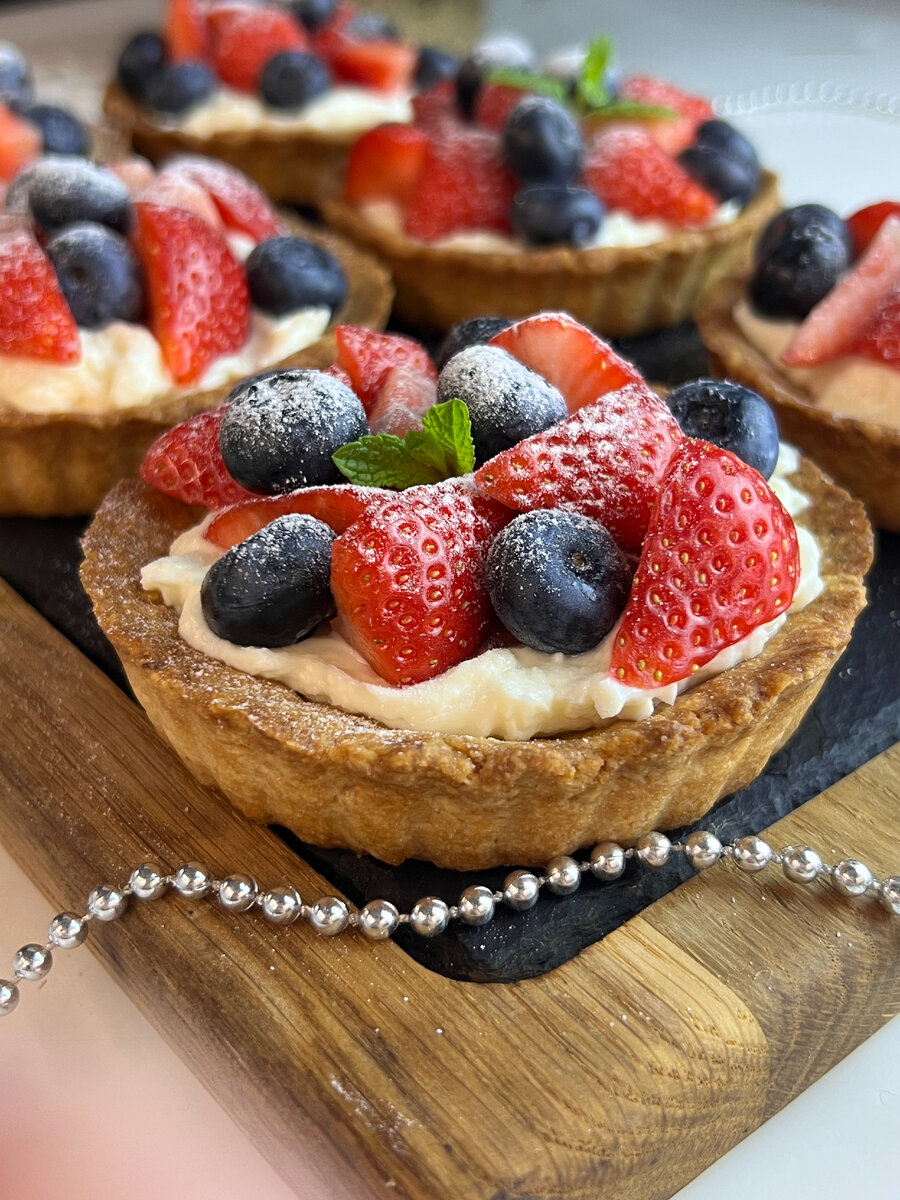 Вместо покупных тортов в новогоднюю ночь! Только представьте: вместо слоев теста с жирным кремом – свежая нежная и очень сладкая клубника Артфрут с тонким ароматом лета. И это мы еще не упомянули, что готовятся эти тарталетки быстро и просто. Клубнику Артфрут можно купить в супермаркетах или на маркетплейсах. Ингредиенты: ✔️Сливочное масло комнатной температуры – 150 г. ✔️Сахарный песок – 70 г. ✔️Мука – 250 г. ✔️Яйцо – 1 шт. ✔️Соль – ½ ч. л. ✔️Ванилин – 1 ч. л. ✔️Сливочный сыр – 120 г. ✔️Сгущенное молоко – 50 г. ✔️Лимонный сок или сок лайма – 1 ст. л. ✔️Клубничный джем – по вкусу ✔️Клубника Артфрут– 1 упаковка ✔️Голубика Артфрут– 1 упаковка Способ приготовления: 1. Взбиваем сливочное масло комнатной температуры с сахаром, затем добавляем муку, соль, куриные яйца, ванилин. Замешиваем тесто и убираем в холодильник на 1 час 2. Далее раскатываем тесто в пласт не слишком тонко и вырезаем кругом будущие тарталетки. Выкладываем тесто в форму для запекания тарталеток и распределяем. Делаем о