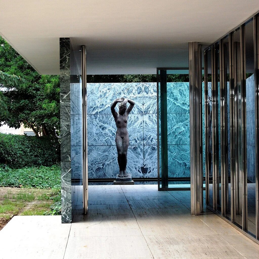 Архитектурная судьба голландского зодчего Людвига Мис ван дер Рое была невероятно удачной. Работая в Германии, он создал немало интересных построек, и даже возглавлял Баухауз — ведущую школу дизайнерского образования в Германии 20-30-х годов. Позже в Америке он руководил архитектурным факультетом Иллинойского технологического института и создал своё направление в архитектуре небоскрёбов, которое назвали его именем. Мис ван дер Рое одним из первых применил стальной каркас и сплошной остекление в частной архитектуре (до этого стекло и металл в основном оформляли промышленные здания). Со стилем Миса связывают и появление европейского и американского минималистского интерьера, вернее тот его вариант, когда кажущаяся простота обстановки достигается точным математическим расчётом и дорогими материалами. Минимализм, как принцип интерьерной декорации прослеживается у Мис ван дер Рое даже на уровне планировочной схемы. Мечтая о создании универсального интерьера, пригодного для многих случаев, о