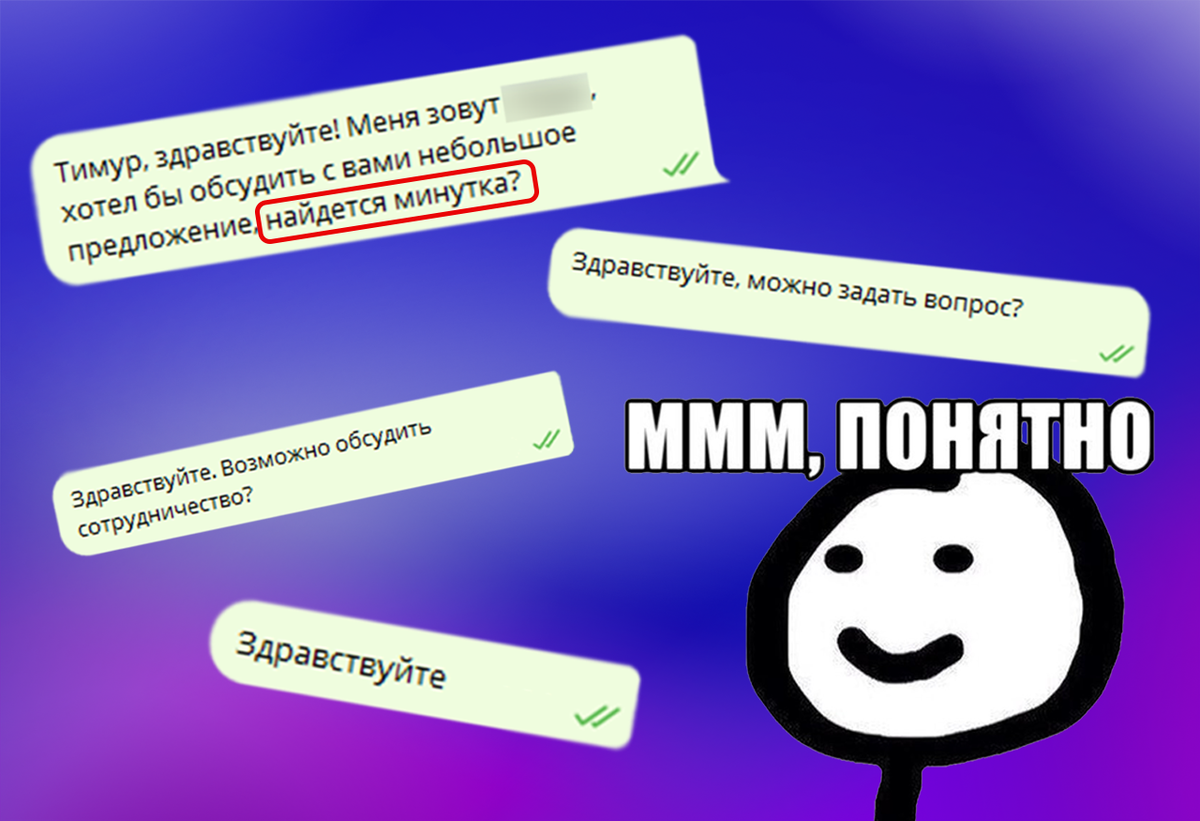 – Здравствуйте. Возможно обсудить сотрудничество? Серьезно, вы ведь уже отняли «минутку» на прочтение вашего сообщения. Зачем лишний раз тратить и свое, и чужое время?