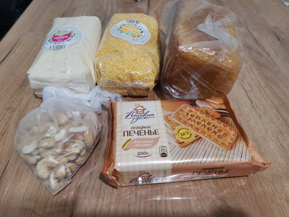 Покупки за день на фото - хлеб, крупы, орехи кешью, печенье.