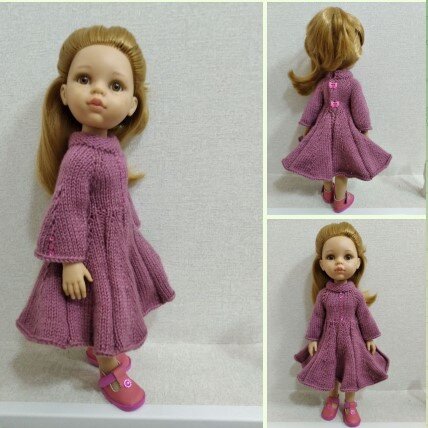 МК вяжем платье спицами для Паолы Рейна 32 см. Для работы использую круговые спицы №3 и пряжу "Детская Новинка" (цвет 179 фиалка, длина 200 м, вес 50 г). В процессе работы периодически мерим кукле не снимая со спиц. Данная модель хорошо регулируется и по количеству петель (кратно 4) и по количеству рядов. Набрать 28 петель. 6 рядов вязать лицевой гладью (в нечетных рядах - все изнаночные петли, в четных - все петли лицевые). 7 ряд: кромочная, 1 лицевая, 2 вместе, 1 накид (отверстия для пуговки), 3 лицевых, накид, 1 лицевая, накид, 4 лицевых, накид, 1 лицевая, накид, 6 лицевых, накид, 1 лицевая, накид, 4 лицевых , накид, 1 лицевая, накид, 3 лицевых, кромочная. 8 ряд: все изнаночные петли. 9 ряд: кромочная, 6 лицевых, накид, 1 лицевая, накид, 6 лицевых, накид, 1 лицевая, накид, 8 лицевых, накид, 1 лицевая, накид, 6 лицевых , накид, 1 лицевая, накид, 4 лицевых, кромочная. 10 ряд: все изнаночные петли. 11 ряд: кромочная, 7 лицевых, накид, 1 лицевая, накид, 8 лицевых, накид, 1 лицевая, наки