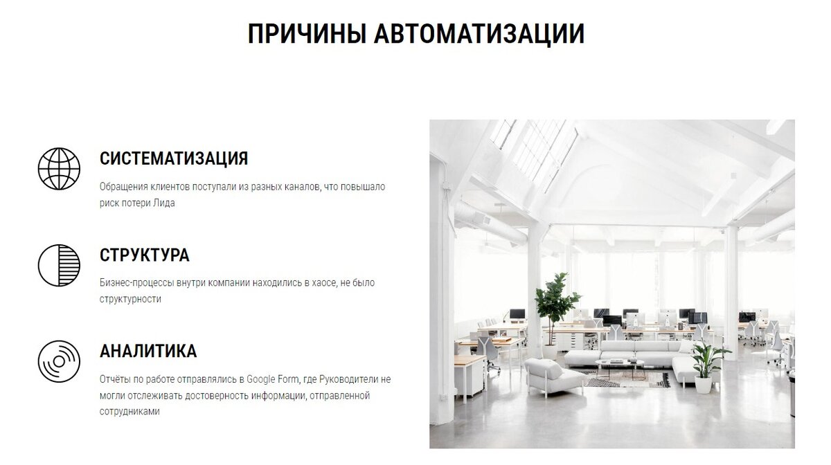 Ответ в описании нашего нового кейса: посмотреть кейс на нашем сайте ПРОБЛЕМЫ РЕШЕНИЕ ( на базе Битрикс24 международной версии) СRM-СИСТЕМА OБЪЕДИНЯЕТ Интеграция CRM-системы с Telegram и E-mail позволила получать обращения клиентов в одной системе. Скорость обработки заявки выросла на 9% АВТОМАТИЧЕСКОЕ РАСПРЕДЕЛЕНИЕ ЗАЯВОК Создано 11 воронок, где происходит правильное и логичное распределение сделок по отделам. Конверсия воронки продаж увеличилась на 12% ОТЧЕТЫ ПО ОДНОМУ КЛИКУ Реализована автоматизация, которая подключает нужного руководителя в момент поступления отчёта от сотрудника. Время согласования отчетов сократилось на 13%. Посмотреть кейс на нашем сайте