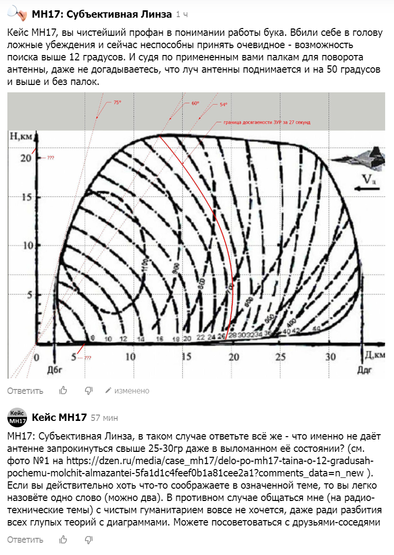 Статья написана 3 года назад, но сегодняшняя дискуссия с автором показала, что он находится в прежнем заблуждении до такой степени, что не может или не хочет признать очевидные вещи. В посте Кейс МН17 имеется ссылка на его указанную выше статью и эти фото: И здесь стала понятна причина его заблуждения. Оказывается, в его понимании луч антенны смотрит только туда, ку