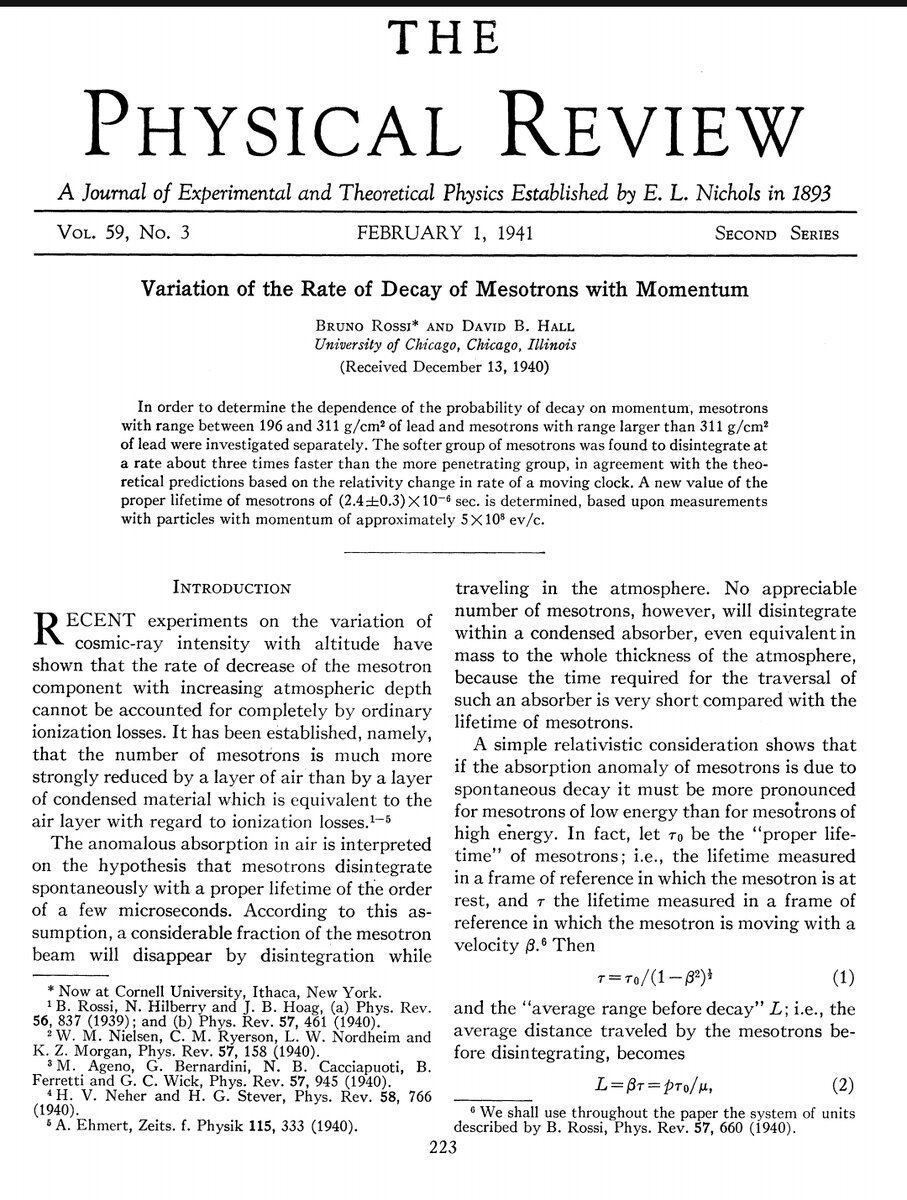 Вот страничка журнала "The Physical Review" с началом статьи Росси и Холла 1941 года, в которой описан эксперимент: