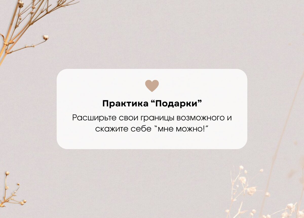 ☀ Всем привет. У нас долгожданная практика на тему подарков. Итак, друзья, у нас сегодня будет настоящее практическое задание, состоящее из трех пунктов. Первый пункт. 🔸 Вам нужно будет купить себе что-то со скидкой. Это может быть одежда, косметика, что угодно. Купите себе что-то и запишите ощущения, что вы чувствуете, когда вы покупаете со скидкой, оптом, с большой скидкой 70%-90%, покупаете в outlet, или по акции. Чем больше скидка, тем лучше. Второй пункт. 🔸 Вам нужно будет сделать СЕБЕ подарок. Себе лично. Нужно будет подумать, что вы можете себе подарить именно сегодня. Выбрать какую-то вещь или услугу и не откладывая подарить себе. Если у вас есть четкое понимание того, что вы хотели и в принципе, у вас сходятся ваши денежные средства имеющиеся на карте или наличными, то вот время пришло. Обязательно, чтобы это был долгожданный, нужный подарок вам самим себе. «Я сам(а) себе могу дать» Третий пункт. 🔸 Подарок нужно будет попросить. Я не знаю, будет это ваш муж, моло