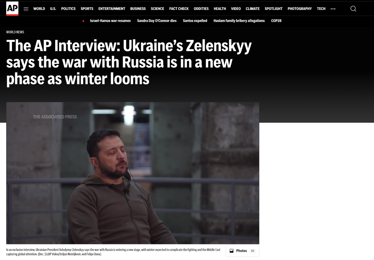Сегодня стало известно об освобождении села Марьинка. Один из тех, что зудел многие месяцы. Казалось вот-вот, ещё немного... Не думаю, что эти события связаны, но пока ещё избранный президент (до марта 2024) Зе дал большое интервью агентству Associated press. Репортаж оформлен в мрачных траурных тонах, впрочем и содержание... явно не то о чём хотели бы рассказать читателям "режиссёры спектакля". Сменив богато обставленный кабинет на Банковой со этим зелёным креслом. По слухам дизайн его вдохновлён кабинетом самой бабушки Лизы - почившей год назад королевы Британии. В этот раз какие-то мрачные бараки в духе "Сталкера" или может быть бункер "кричи не кричи"? Что именно они хотели этим сказать? Загадка! Но что-то точно хотели.