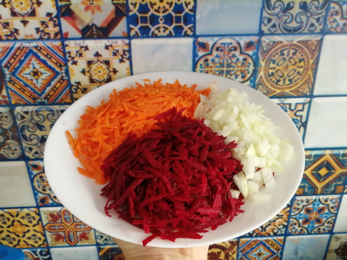 ✔ Овощи нарезать, кроме моркови и свеклы - её натираю на тёрке). Лук, морковь и свёклу притушить на сковороде.