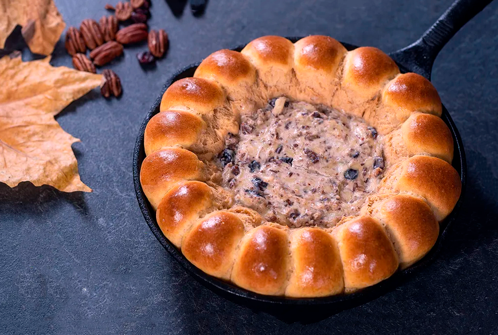 Этот хлеб из сладкого картофеля на сковороде с соусом из клюквы и сыра с орехами пекан — одно из самых впечатляющих и восхитительных блюд, которые вы можете приготовить для праздничных встреч. Сковорода состоит из пышных и мягких домашних булочек из сладкого картофеля с теплым липким соусом из плавленого сыра с поджаренными орехами пекан, сушеной клюквой и медом в центре. Вы просто берете кусок хлеба, намазываете его сверху теплым сырным соусом и наслаждаетесь одним из самых приятных блюд на свете.